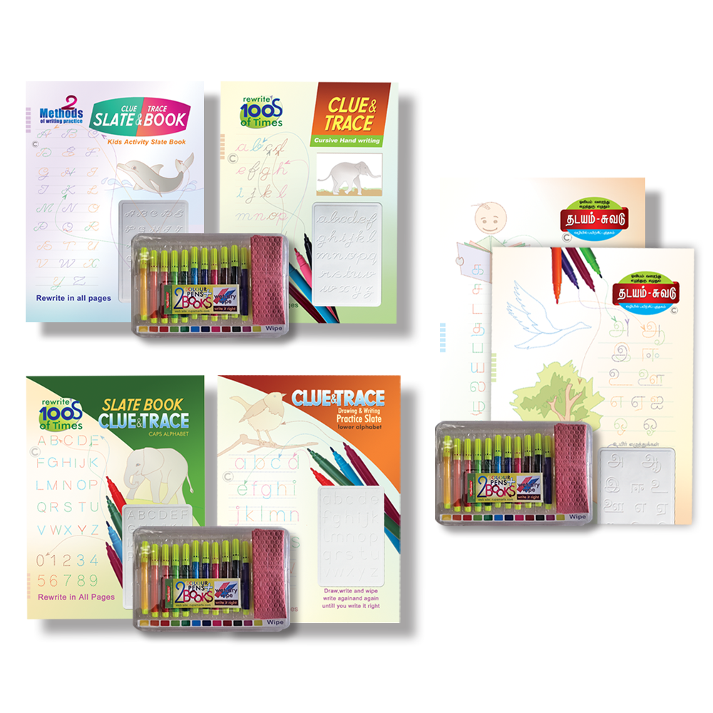 Kids can easily learn different shapes of the letters with water colors pens by connecting the dots. The skill acquired through clue slate will ease the knack of learning the shapes of letters. With trace book children can write , wipe and write as many times as they want until they attain perfection in the shape of the letters. Thus children can learn themselves