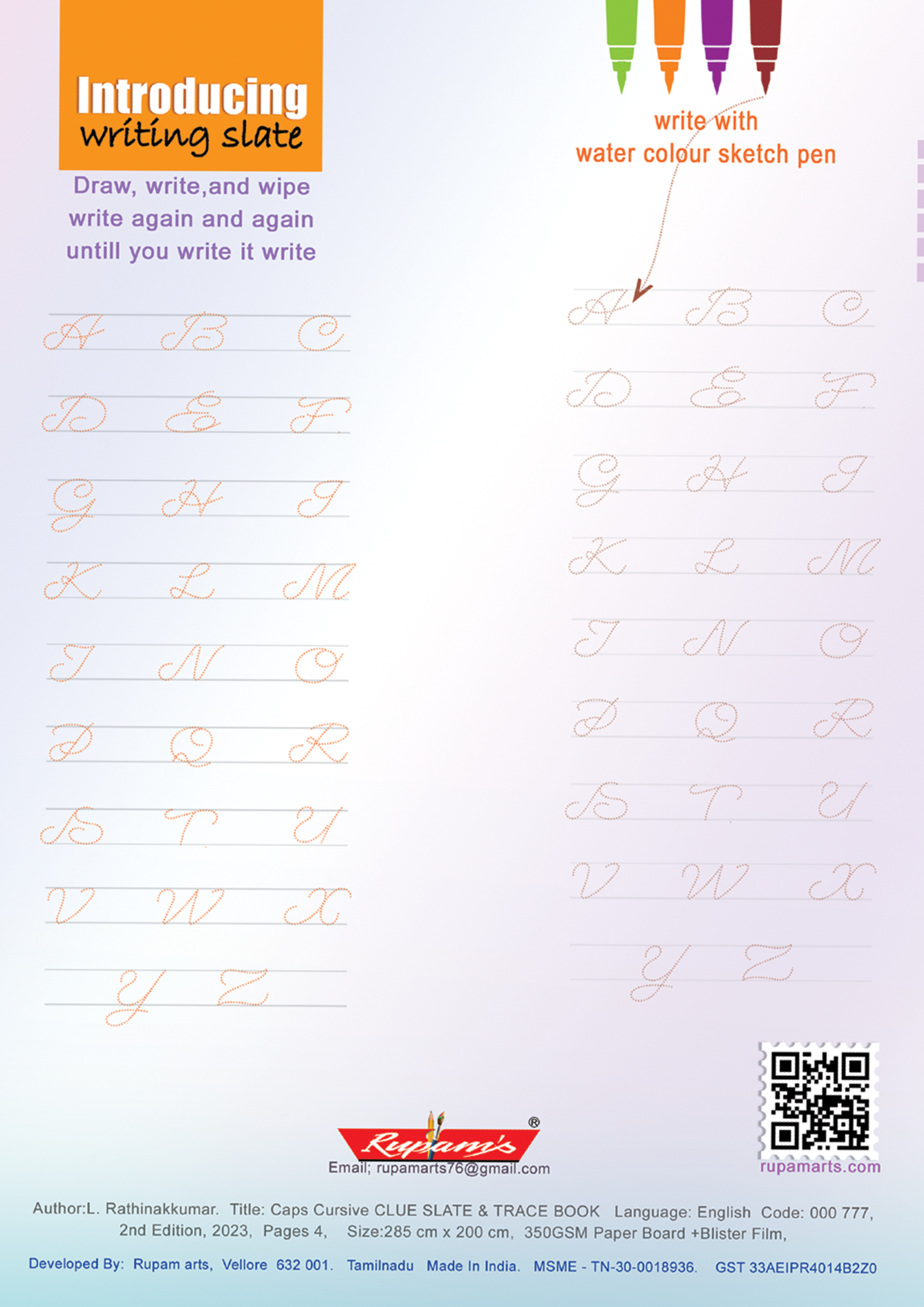This RUPAM ENGLISH CURSIVE UPPERCASE writing practice booklet clue slate encourages children who are interested in playing rejoicing, reveals and merry making etc. they can learn letters by themselves following clues given indifferent attractive colors. This method certainly develops the kids wonderful motor skills and fine nerve control to the fingers handling pencil. Clue slate has been designed based on modern technique of teaching and learning.